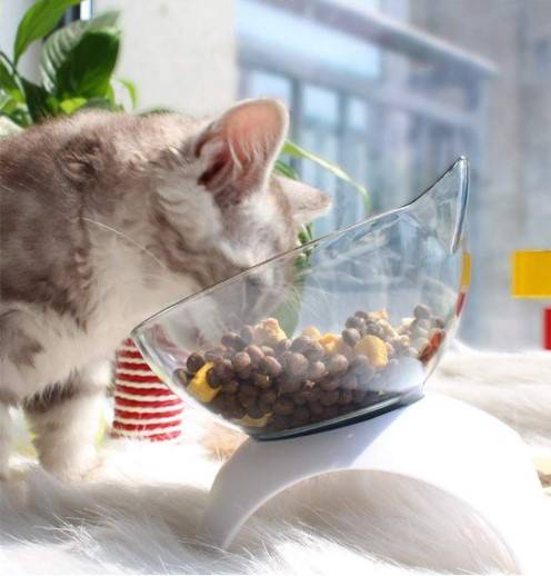 Possui uma base inclinada que eleva a parte traseira da tigela, ajudando a reduzir a tensão no pescoço e na coluna ao comer ou beber.