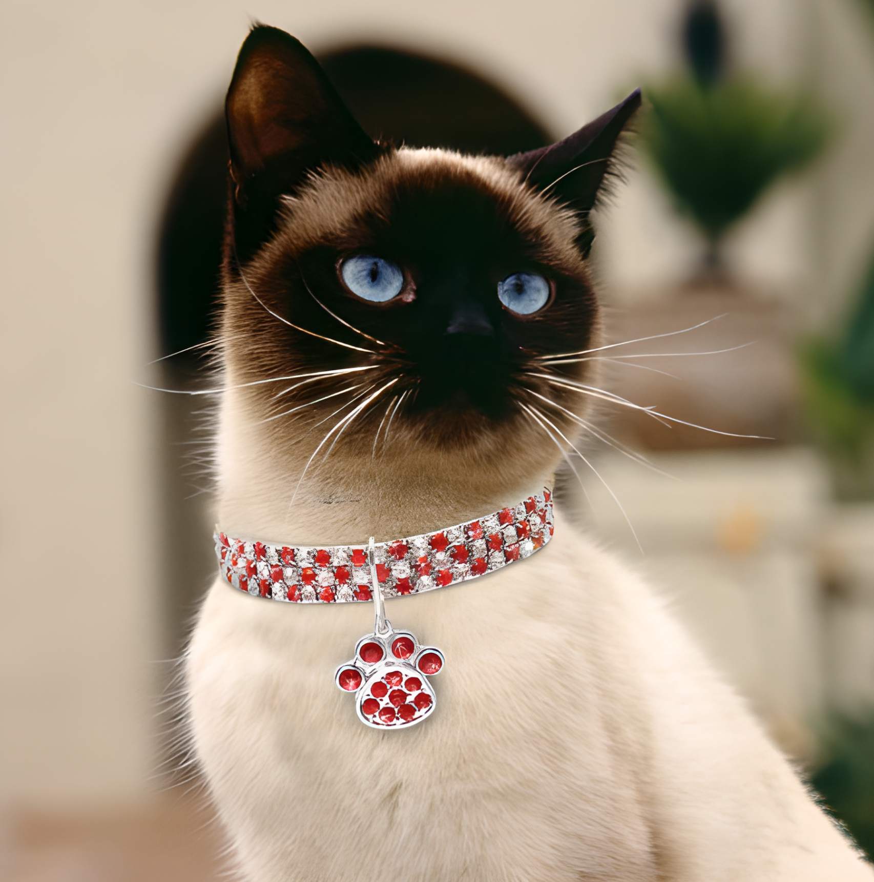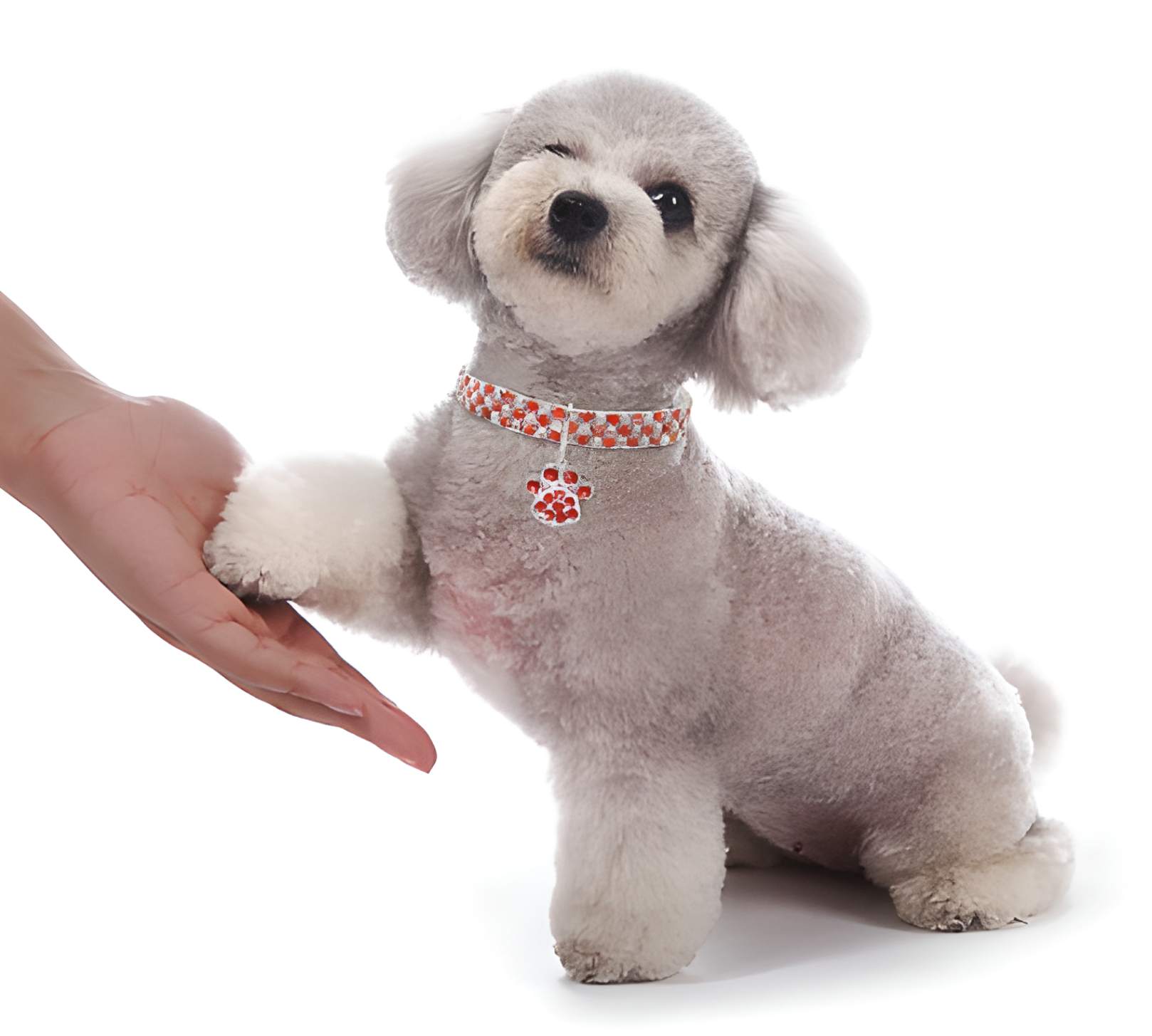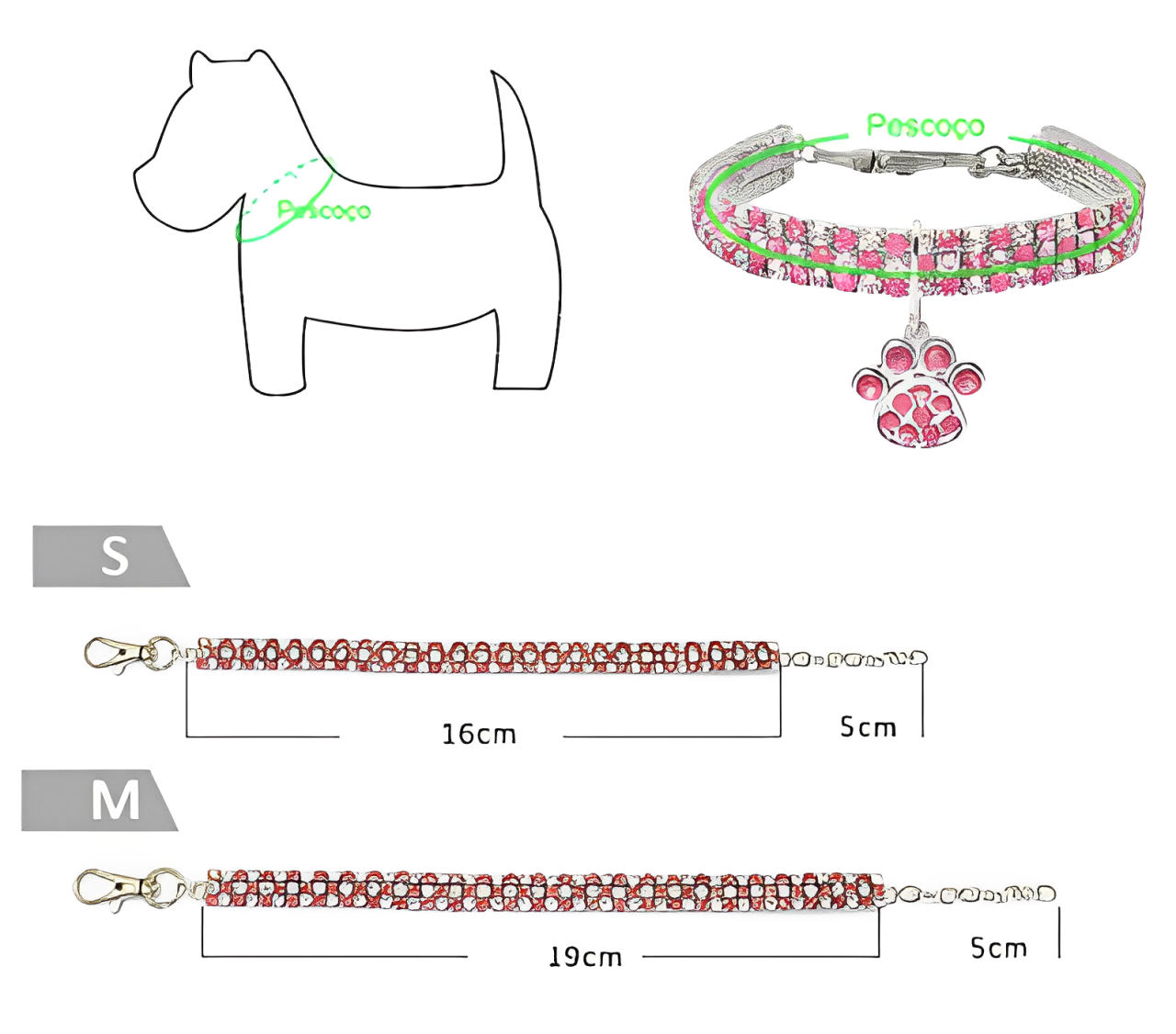O design personalizado com pingente em formato de coração ou pata vem nas cores vermelho, azul, branco, preto e rosa.